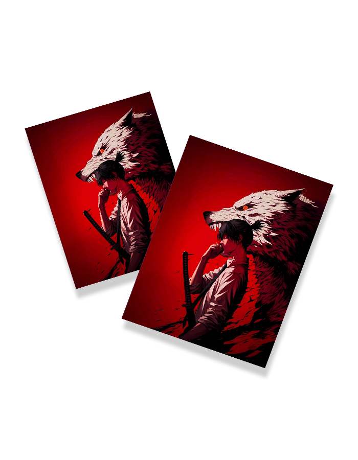 Channel the calm before the storm with Aki Hayakawa and his Fox Devil companion in this striking *Chainsaw Man* artwork. Aki stands brooding, katana at his side, while the demonic visage of the Fox Devil looms behind, teeth bared and glowing with deadly intent. This print masterfully blends the human and supernatural in vivid crimson tones, reflecting the duality of Aki’s life as a devil hunter. A haunting addition for those drawn to quiet strength, complex characters, and eerie tension.
