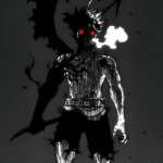 Darkness radiates from this intense Asta silhouette. His red glowing eyes pierce through a body cloaked in shadows. Devil form activated—no background, just pure raw line art and power. For fans of minimalist contrast and maximal impact.