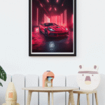 This eye-catching piece features the iconic Corvette ZR1 speeding through neon-lit streets, blending power with urban cool. Perfect for those who admire fast cars and dynamic cityscapes.