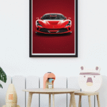 Showcasing the sleek side profile of Ferrari’s F8, this poster captures motion even while still. Set against a fiery red backdrop, it embodies luxury, performance, and the emotional pulse of Italian engineering. A wall-worthy piece for auto aficionados.