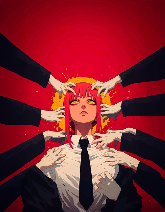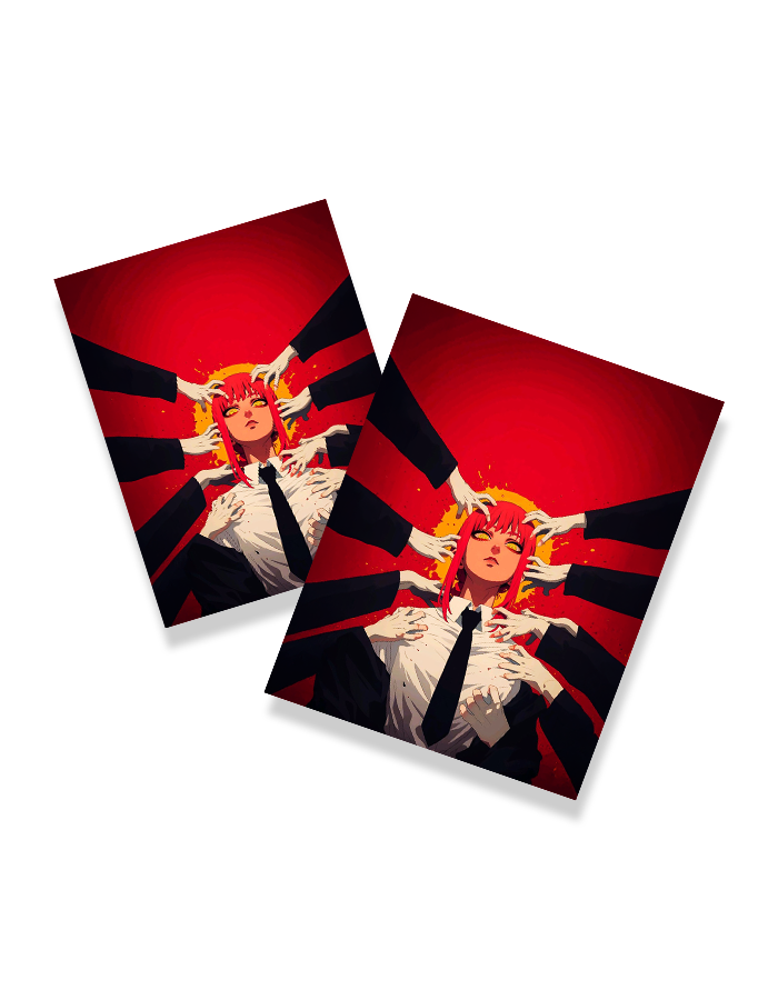 This hypnotic poster of Makima from *Chainsaw Man* draws you into her world of eerie control and chilling charisma. Surrounded by ghostly hands reaching toward her, Makima’s golden eyes remain cold and unblinking — a symbol of power and manipulation. The surreal contrast of her composed figure with the chaotic worship around her paints a psychological portrait of one of anime’s most enigmatic characters. Ideal for fans who crave depth, dominance, and disturbing beauty.