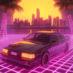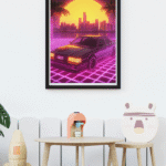 Transform your room with this dynamic and nostalgic piece featuring an Audi against a vibrant neon sunset backdrop. This retro-inspired art brings the bold energy of the 80s straight into your home. Whether you’re a car enthusiast or simply love unique, futuristic designs, this poster will ignite your space with style.