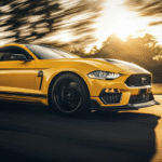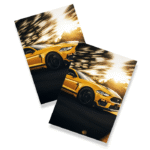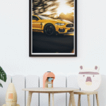 Soak in the sunset with this rear-view poster of a yellow Mustang GT. Captured during the golden hour with gentle motion blur, this print balances elegance and power, speed and serenity.