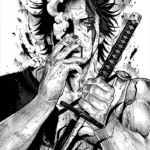 This gritty samurai-style poster shows a bloodied warrior mid-smoke, blade in hand, drawn in full manga shading. Ink lines, smoke plumes, and expressive texture create a black-and-white masterpiece of anime defiance and calm rage.